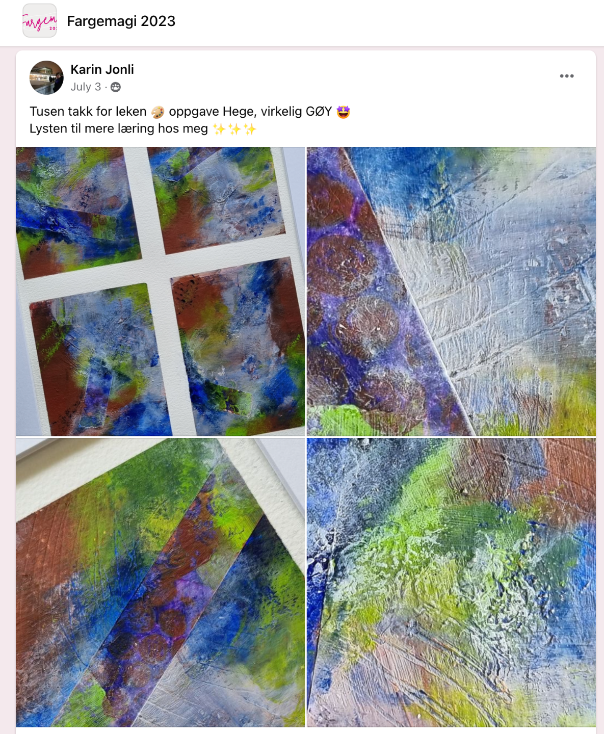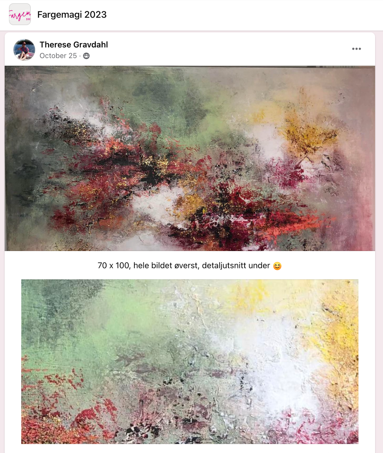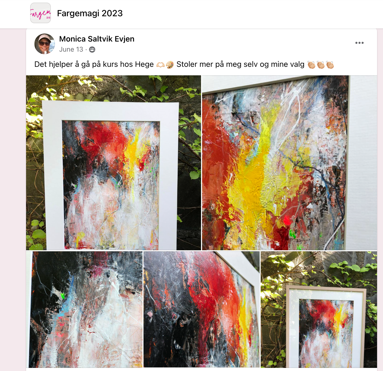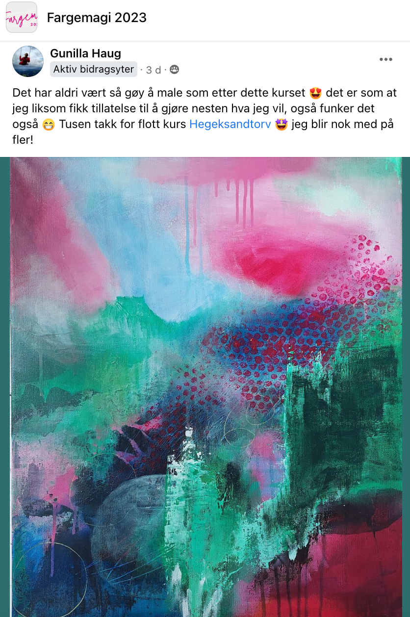 Jeg elsker jobben min, og høydepunktene er når jeg får meldinger fra dere som har suksess, som har hengt sitt første maleri på veggen, solgt sitt første maleri eller hatt suksess med en utstilling. Det varmer skikkelig!