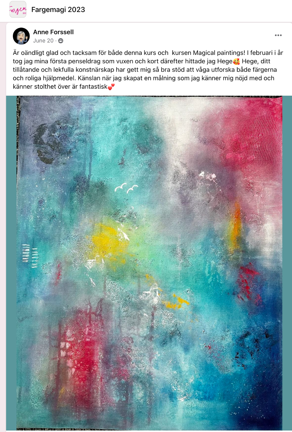 Monica Saltvik Evjen har gått flere kurs og er med i maleklubben. Dagen før vi spilte inn denne filmen hadde hun og meldt seg på Fargemagi.